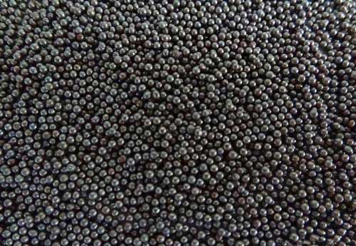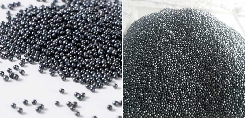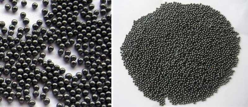 鑄鋼丸是由高質(zhì)量的鋼碎料制成的,首先將其溶化,然后用高壓水噴射式使熔融的鋼水形成小球狀。形成的丸體再次加熱以凈化勻質(zhì),然后進行淬火處理。淬火后的丸體在熔爐內(nèi)進行烘干并重新加熱回火以達到適當?shù)挠捕?,回火處理的鋼丸通過機械篩網(wǎng)被分選成符合SAE標準的11個等級以用于拋丸設備。不同粒度和硬度的產(chǎn)品用于不同的工藝,如表面強化等。
